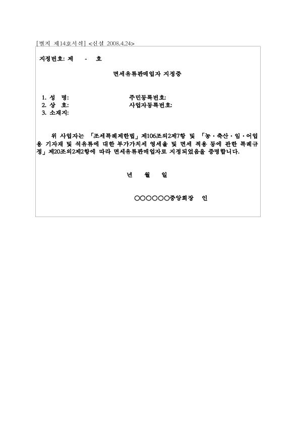 Á¦14È£ ¸é¼¼À¯·ùÆÇ¸Å¾÷ÀÚÁöÁ¤Áõ 20080424 |