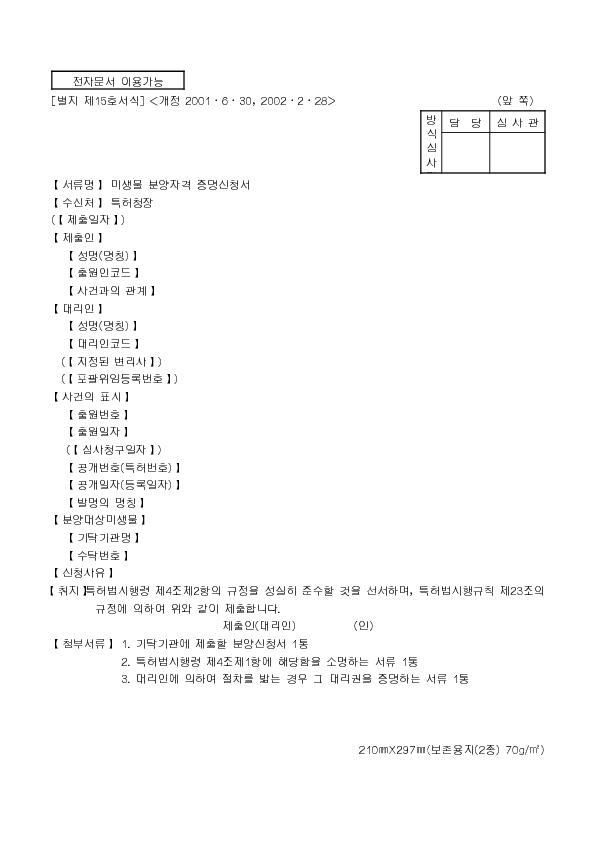 ¹Ì»ý¹°ºÐ¾çÀÚ°Ý Áõ¸í½Åû¼(02.2.28(º°Áö Á¦15È£¼½Ä) |