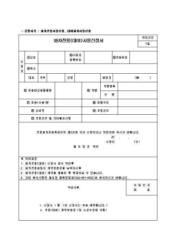 ÈÂ÷Àü¿ë(´ë¿©)»ç¿ë½Åû¼ »ùÇà ¾ç½ÄÀÔ´Ï´Ù. º» ÀÚ·á´Â ûµµÃ»¿¡ ÈÂ÷Àü¿ë ´ë¿© ¹× »ç¿ë½Åû ½Ã Àü¿ëÈÂ÷¿î¼ÛÃë±Þ±ÔÄ¢ Á¦3Á¶¿¡ ÀǰŠÇÏ¿© ½Åû ÇÒ ¼ö ÀÖ´Â ÈÂ÷Àü¿ë(´ë¿©)»ç¿ë½Åû¼ ¾ç½ÄÀÔ´Ï´Ù. |