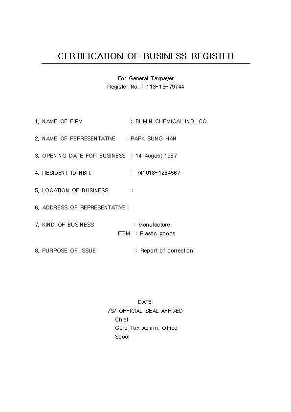 ¿µ¹®»ç¾÷ÀÚµî·ÏÁõCertificationOfBusinessRegister |