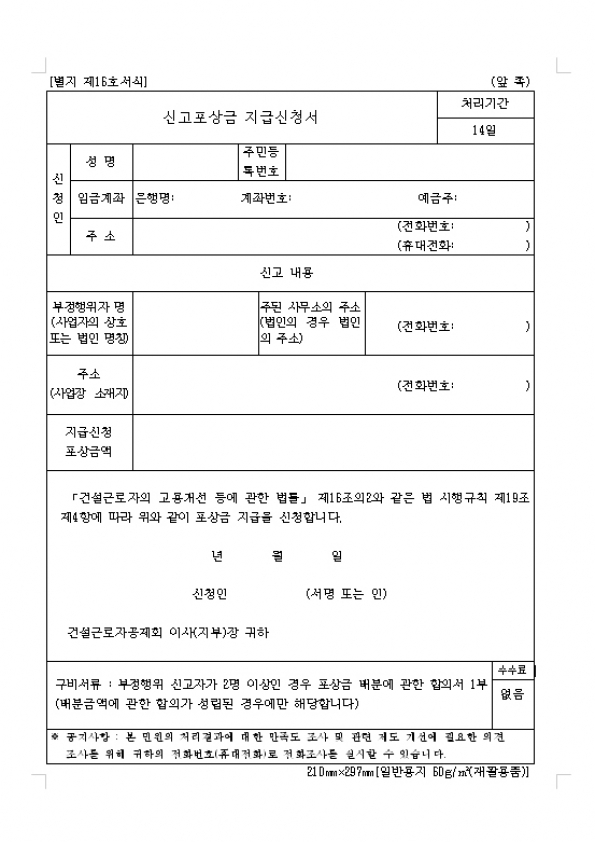 °Ç¼³±Ù·ÎÀÚ °í¿ë°³¼± ½Å°íÆ÷»ó±Ý Áö±Þ½Åû¼ |