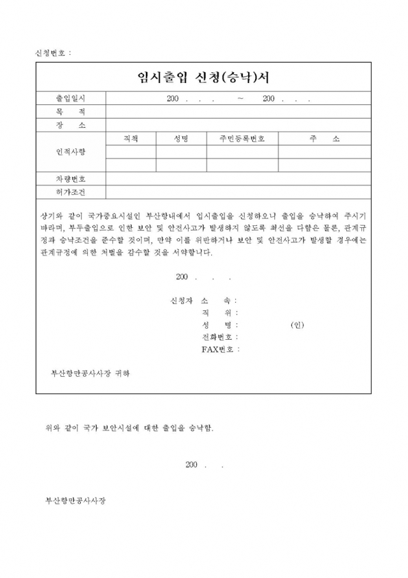 Àӽà ÃâÀÔ ½Åû¼´Â ÃâÀÔÀϽÃ, ¸ñÀû, Àå¼Ò, ÀÎÀû»çÇ×, Â÷·®¹øÈ£, Çã°¡Á¶°Ç µîÀÇ Ç׸ñÀ¸·Î ±¸¼ºµÇ¾î ÀÖ½À´Ï´Ù. |