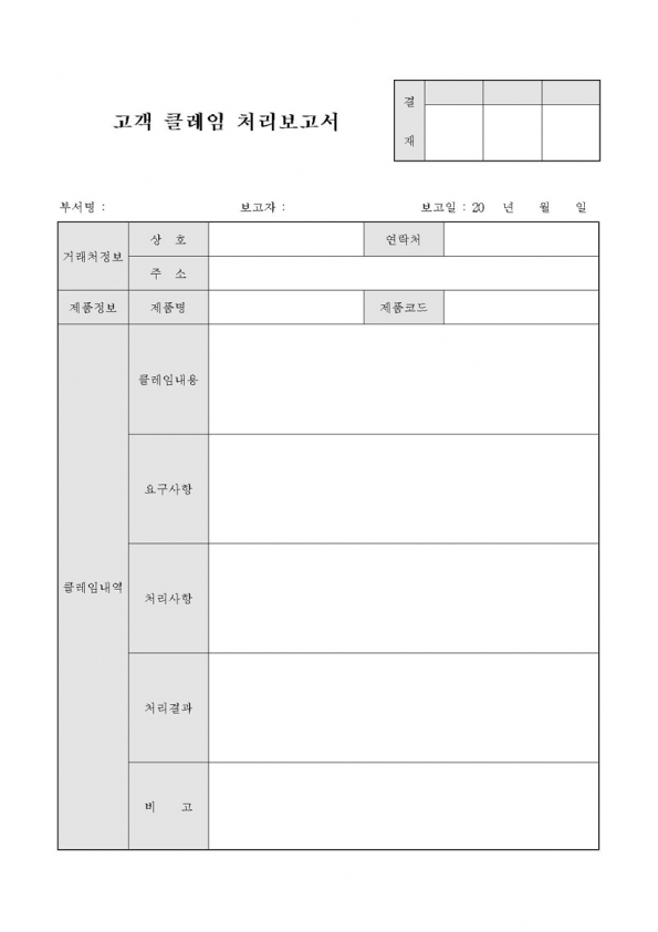 °í°´ÀÇ Å¬·¹ÀÓ ¿äû½Ã Ŭ·¹ÀÓÀÇ ³»¿ë°ú ¿ä±¸»çÇ×, 󸮻çÇ×, 󸮰á°úµîÀ» ±â·ÏÇÏ¿© º¸°í½Ã »ç¿ëÇϴ ó¸® º¸°í¼ÀÔ´Ï´Ù. |