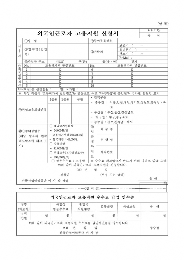 ¿Ü±¹ÀÎ ±Ù·ÎÀÚ °í¿ë Áö¿ø ½Åû¼´Â »ç¿ëÀÚÀÇ ÀÎÀû»çÇ×, ¿Ü±¹ÀÎ ±¸Á÷ÀÚ, Ãë¾÷±³À°Èñ¸Á±Ç¿ª µîÀÇ Ç׸ñÀ¸·Î ±¸¼ºµÇ¾î ÀÖ½À´Ï´Ù. |