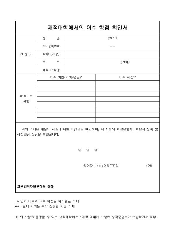 ±³À°À» À̼öÇÏ¿´À½À» Áõ¸íÇÏ´Â ÀçÀû´ëÇÐÀ̼ö È®Àμ ¾ç½ÄÀ¸·Î¼ Áõ¼¹øÈ£ ¹× ¼º¸í, Áֹεî·Ï¹øÈ£, À̼ö±â°£, À̼öÇÐÁ¡ µîÀ» ÀÛ¼ºÇϵµ·Ï ±¸¼ºµÇ¾î ÀÖ½À´Ï´Ù.