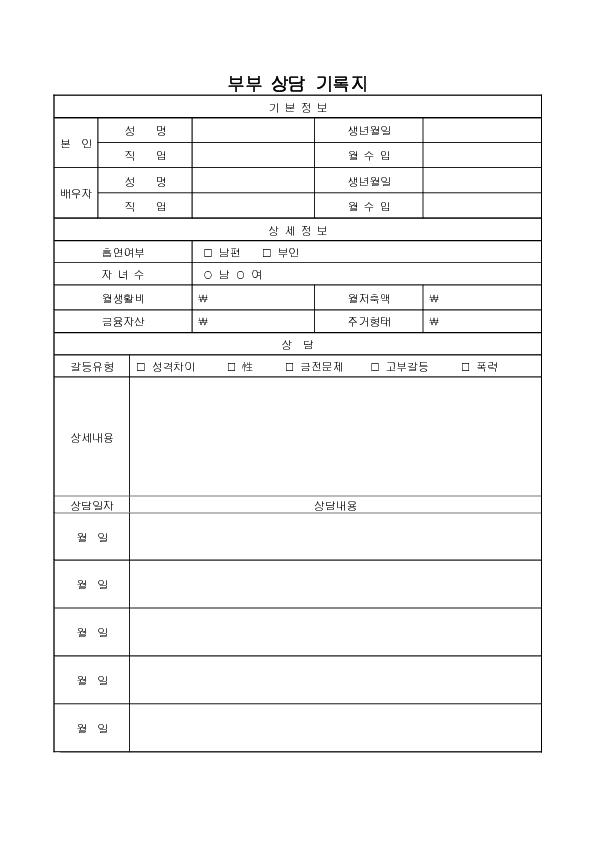 ºÎºÎ»ó´ã±â·ÏÁöÀÔ´Ï´Ù. ºÎºÎŬ¸®´Ð¿¡¼ »ç¿ëÇÏ´Â ºÎºÎµéÀÇ ½Å»ó¸í¼¼¿Í °¡Á·»çÇ× ±×¿Ü ±ÝÀü»çÇ×À» ±â·ÏÇÏ°í °¥µîÀ» ÀÏÀ¸Å°´Â ¹®Á¦¸¦ »ó´ã ³¯Â¥¸¶´Ù ±â·ÏÇÏ¿© ¹®Á¦¸¦ ÇØ°áÇÒ¶§ »ç¿ëÇÏ´Â ±â·ÏÁöÀÔ´Ï´Ù. |