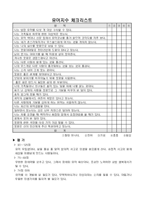 À¯¸ÓÁö¼öüũ¸®½ºÆ®ÀÔ´Ï´Ù. ÀÚ½ÅÀÇ À¯¸Ó°¡ ¾î´ÀÁ¤µµ µÇ´ÂÁö °¢ ¹®Ç׿¡ ´ë´äÀ» ÇÏ°í ±×¿¡ µû¸¥ Á¡¼ö¸¦ ÇÕ»êÇÏ¿© °á°ú¸¦ ¾Ë¾Æº¸´Â üũ¸®½ºÆ® Çü½ÄÀÇ ¼½ÄÀÔ´Ï´Ù. |