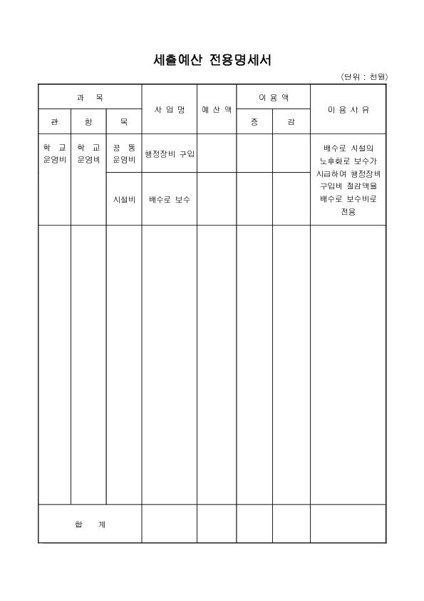 °¢°ú¸ñÀÇ »ç¾÷¸í, ¿¹»ê¾×, Áõ°¨¿¡ µû¸¥ ÀÌ¿ë¾×, ÀÌ¿ë»çÀ¯·Î ±¸¼ºµÇ¾î ÀÖ´Â ¼¼Ã⿹»ê Àü¿ë ¸í¼¼¼ ÀÔ´Ï´Ù. |