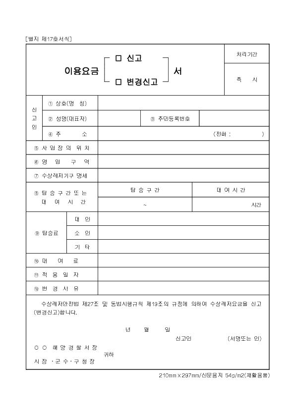 ¼ö»ó·¹Àú¾ÈÀü¹ý Á¦27Á¶ ¹× µ¿¹ý½ÃÇà±ÔÄ¢ Á¦19Á¶ÀÇ ±ÔÁ¤¿¡ ÀǰÅÇÑ ÀÌ¿ë¿ä±Ý ½Å°í ¹× º¯°æ½Å°í¼·Î ½Å°íÀÎ ÀÎÀû»çÇ×, »ç¾÷ÀåÀÇ À§Ä¡, ¿µ¾÷±¸¿ª, ¼ö»ó·¹Àú±â±¸¸í¼¼, ž½Â±¸°£ ¶Ç´Â ´ë¿©½Ã°£ µîÀ» ±âÀçÇÕ´Ï´Ù. |
