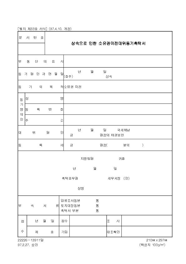 Á¦33È£ »ó¼ÓÀ¸·Î ÀÎÇÑ ¼ÒÀ¯±ÇÀÌÀü´ëÀ§µî±âÃËŹ¼(1997.4.10. °³Á¤) |