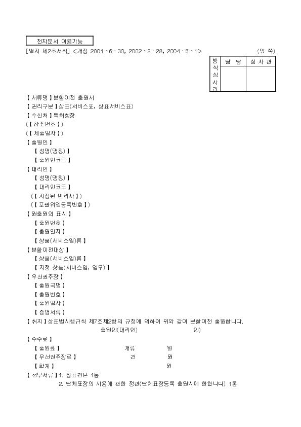 »óÇ¥¹ý½ÃÇà±ÔÄ¢ Á¦7Á¶Á¦2Ç×ÀÇ ±ÔÁ¤¿¡ ÀǰÅÇÑ ºÐÇÒÀÌÀüÃâ¿ø¼ ÀÔ´Ï´Ù. »óÇ¥°ßº» 1Åë, ´ÜüǥÀåÀÇ »ç¿ë¿¡ °üÇÑ Á¤°ü(´ÜüǥÀåµî·Ï Ãâ¿ø½Ã¿¡ ÇÑÇÕ´Ï´Ù) 1Åë, ¾÷¹«ÀÇ °æ¿µ»ç½ÇÀ» ÀÔÁõÇÏ´Â ¼·ù(¾÷¹«Ç¥Àåµî·Ï Ãâ¿ø½Ã¿¡ ÇÑÇÕ´Ï´Ù) 1Åë, »öä(ÀÔü)»óÇ¥ ¶Ç´Â ÁöÁ¤ »óǰ¿¡ ´ëÇÑ ¼³¸í¼ ¶Ç´Â µî·ÏÇϰíÀÚ ÇÏ´Â »óÇ¥¸¦ ±¹¾î·Î ¹ø¿ªÇϰųª À½¿ªÇÑ ¼³¸í¼(Ãâ¿øÀÎÀÌ ÇÊ¿äÇÏ´Ù°í ÀÎÁ¤ÇÏ´Â °æ¿ì¿¡ ÇÑÇÕ´Ï´Ù) 1Åë, ºÐÇÒÀÌÀü¿¡ ÀÇÇÑ Ãâ¿øÀκ¯°æ½Å°í¼ 1Åë, ºÐÇÒÀÌÀüÀÇ ¿øÀÎÀ» Áõ¸íÇÏ´Â ¼·ù 1Åë, ´ë¸®Àο¡ ÀÇÇÏ¿© ÀýÂ÷¸¦ ¹â´Â °æ¿ì ±× ´ë¸®±ÇÀ» Áõ¸íÇÏ´Â ¼·ù 1ÅëÀÌ Ã·ºÎµÇ¾î¾ß ÇÕ´Ï´Ù.