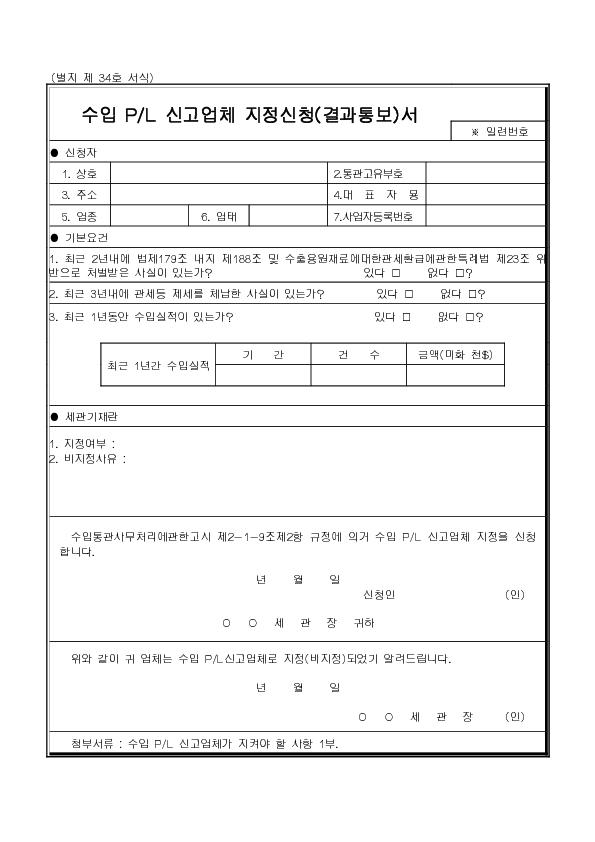 ¼öÀÔÅë°ü»ç¹«Ã³¸®¿¡°üÇѰí½Ã Á¦2-1-9Á¶Á¦2Ç× ±ÔÁ¤¿¡ ÀǰмöÀÔ P/L ½Å°í¾÷ü ÁöÁ¤À» ½ÅûÇÏ°í ½ÂÀιޱâ À§ÇÑ ¾ç½ÄÀÔ´Ï´Ù. µÞ¸é¿¡´Â ¼öÀÔP/L½Å°í¾÷ü°¡ ÁöÄÑ¾ß ÇÒ »çÇ×ÀÌ ±â·ÏµÇ¾î ÀÖ½À´Ï´Ù.