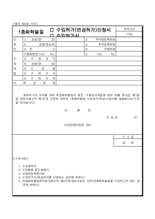 ÈÇй«±âÀÇ ±ÝÁö¸¦ À§ÇÑ Æ¯Á¤ÈÇй°ÁúÀÇ Á¦Á¶ ¼öÃâÀÔ±ÔÁ¦µî¿¡ °üÇÑ ¹ý·ü Á¦12Á¶ Á¦1Ç× ¹× µ¿¹ý½ÃÇà±ÔÄ¢ Á¦7Á¶ÀÇ ±ÔÁ¤¿¡ ÀÇÇÏ¿© 1Á¾ÈÇй°Áú ¼öÀÔÇã°¡(º¯°æ)½Åû¼¸¦ Á¦Ãâ(¼öÀÔÀ» Çã°¡)ÇϰíÀÚ ÇÒ ¶§ »ç¿ëÇÏ´Â 1Á¾ ÈÇй°Áú ¼öÀÔÇã°¡ º¯°æ½Åû¼ ¾ç½ÄÀÔ´Ï´Ù. |