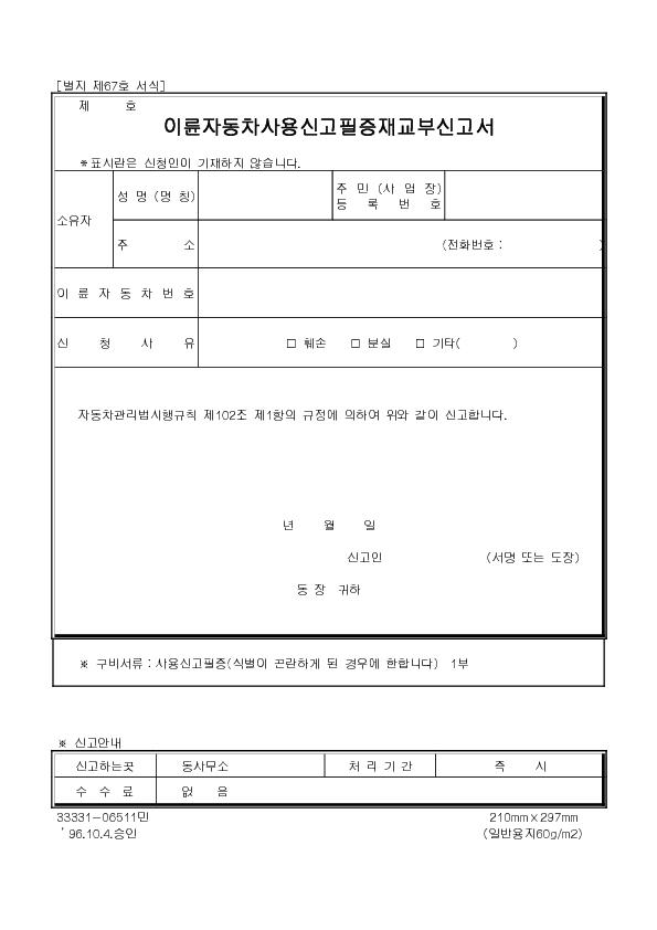 ÀÌ·û ÀÚµ¿Â÷ »ç¿ë½Å°íÇÊÁõ Àç±³ºÎ½Å°í¼ |