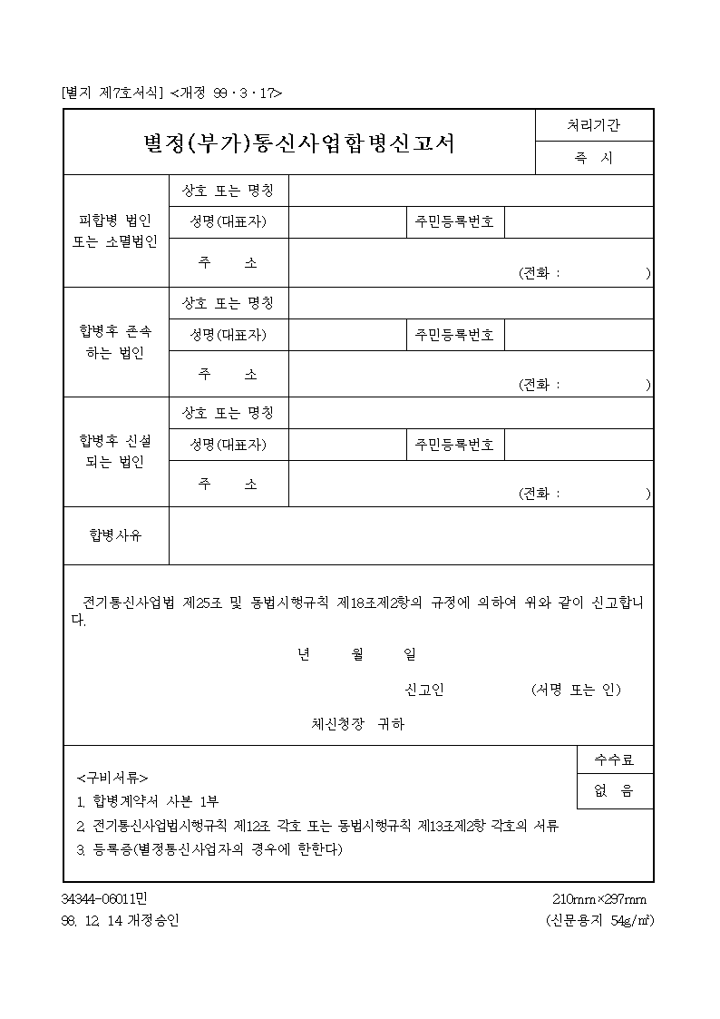 [º°Áö Á¦7È£¼½Ä] Àü±âÅë½Å»ç¾÷¹ý Á¦25Á¶ ¹× µ¿¹ý½ÃÇà±ÔÄ¢ Á¦18Á¶Á¦2Ç×ÀÇ ±ÔÁ¤¿¡ ÀÇÇÏ¿© º°Á¤(ºÎ°¡)Åë½Å »ç¾÷ÀÇ ÇÕº´À» ½Å°íÇÒ ¶§ »ç¿ëÇÏ´Â ¾ç½ÄÀÔ´Ï´Ù |