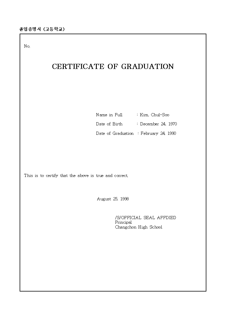 ¿µ¹®À¸·ÎµÈ °íµîÇб³ Á¹¾÷ Áõ¸í¼ÀÔ´Ï´Ù. CERTIFICATE OF GRADUATION