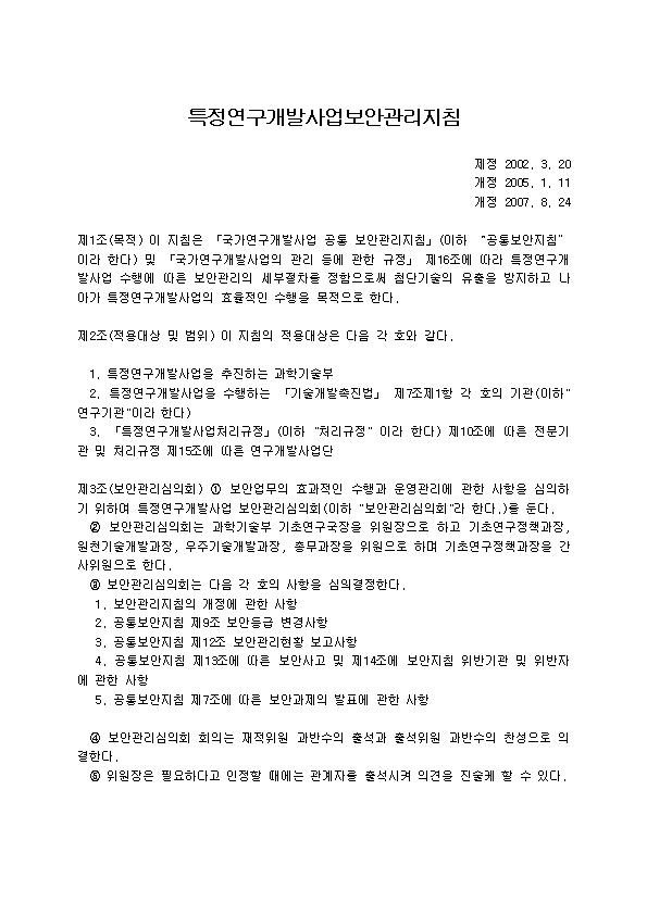 ƯÁ¤ ¿¬±¸°³¹ß»ç¾÷ º¸¾È°ü¸®Áöħ »ùÇÃÀÔ´Ï´Ù. ¡¸±¹°¡¿¬±¸°³¹ß»ç¾÷ °øÅë º¸¾È°ü¸®Áöħ¡¹(ÀÌÇÏ ¡°°øÅ뺸¾ÈÁöħ¡± À̶ó ÇÑ´Ù) ¹× ¡¸±¹°¡¿¬±¸°³¹ß»ç¾÷ÀÇ °ü¸® µî¿¡ °üÇÑ ±ÔÁ¤¡¹ Á¦16Á¶¿¡ µû¶ó ƯÁ¤¿¬±¸°³¹ß»ç¾÷ ¼öÇà¿¡ µû¸¥ º¸¾È°ü¸®ÀÇ ¼¼ºÎÀýÂ÷¸¦ Á¤ÇÔÀ¸·Î½á ÷´Ü±â¼úÀÇ À¯ÃâÀ» ¹æÁöÇÏ°í ³ª¾Æ°¡ ƯÁ¤¿¬±¸°³¹ß»ç¾÷ÀÇ È¿À²ÀûÀÎ ¼öÇàÀ» ¸ñÀûÀ¸·Î Çϴ ƯÁ¤¿¬±¸°³¹ß»ç¾÷ º¸¾È°ü¸®ÁöħÀÔ´Ï´Ù. |