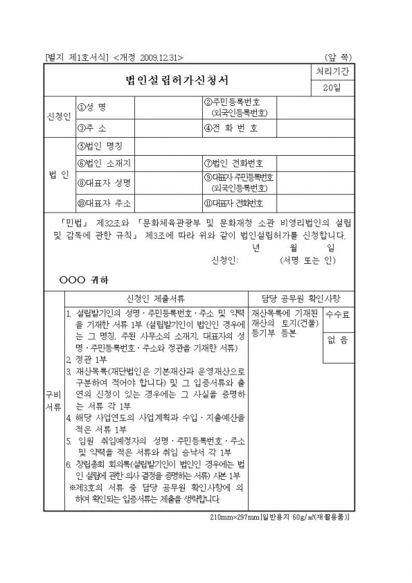¹Î¹ý¡¹ Á¦32Á¶¿Í ¡¸¹®ÈüÀ°°ü±¤ºÎ ¹× ¹®ÈÀçû ¼Ò°ü ºñ¿µ¸®¹ýÀÎÀÇ ¼³¸³ ¹× °¨µ¶¿¡ °üÇÑ ±ÔÄ¢¡¹ Á¦3Á¶¿¡ µû¶ó À§¿Í °°ÀÌ ¹ýÀμ³¸³Çã°¡¸¦ ½Åû¼ÀÔ´Ï´Ù. |